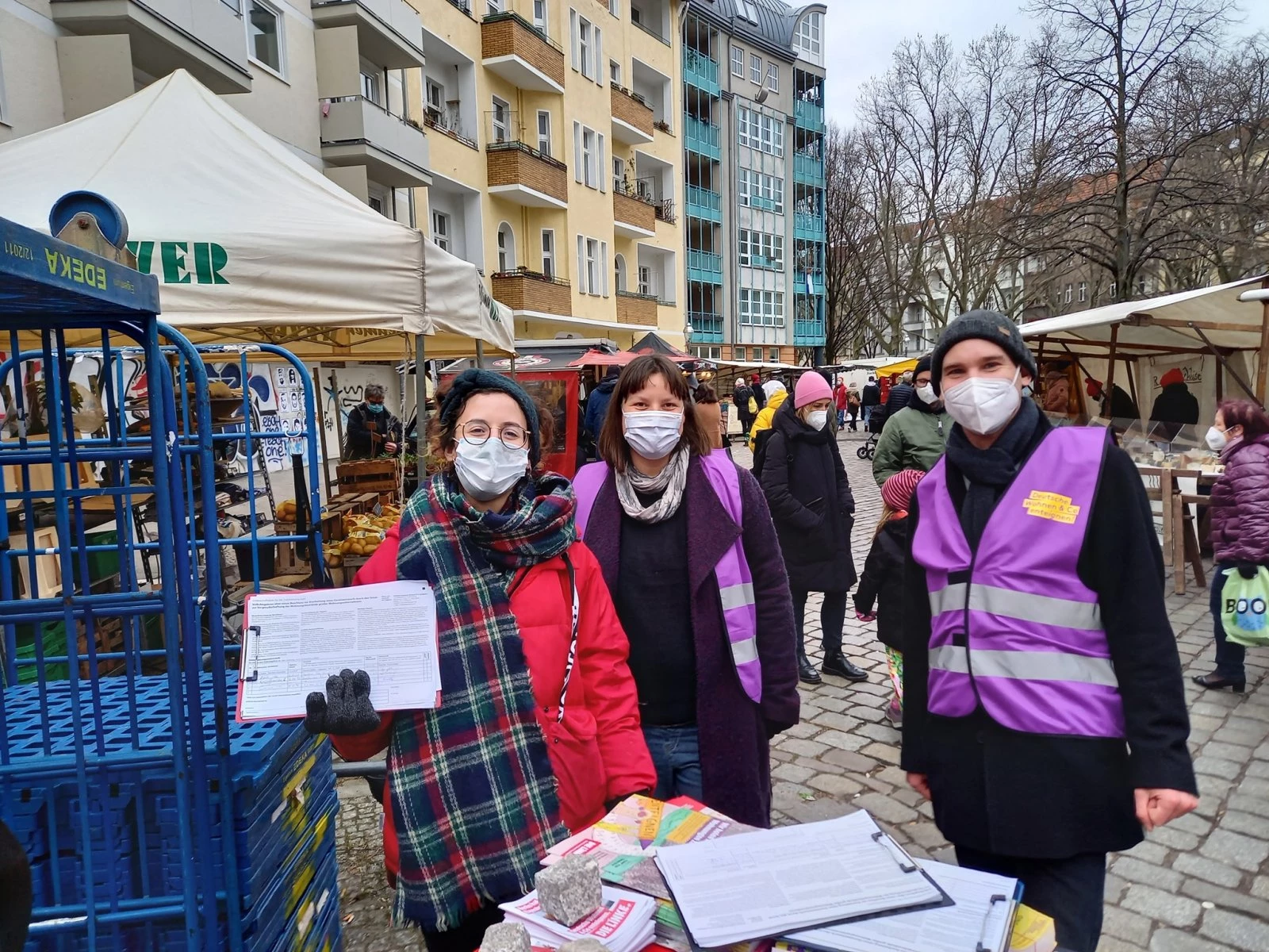Auch in Kreuzberg am Südstern finden sich heute eine Handvoll Genoss:innen ein, um das Unterschriften sammeln mal auszutesten. Hier ist samstags immer Markt, also sollten auch trotz Corona und grauem Himmel ein paar Menschen unterwegs sein, so die Überlegung. Im Laufe des Nachmittags kommen noch viele Menschen auf direktem Weg mit zielsicherem Blick auf den Stand zu. Da bleibt dann in der Regel gar nicht genug Zeit, um die reichlich überlegte Ansprache auszuformulieren, denn die meisten greifen sofort nach einem Kugelschreiber und unterschreiben.