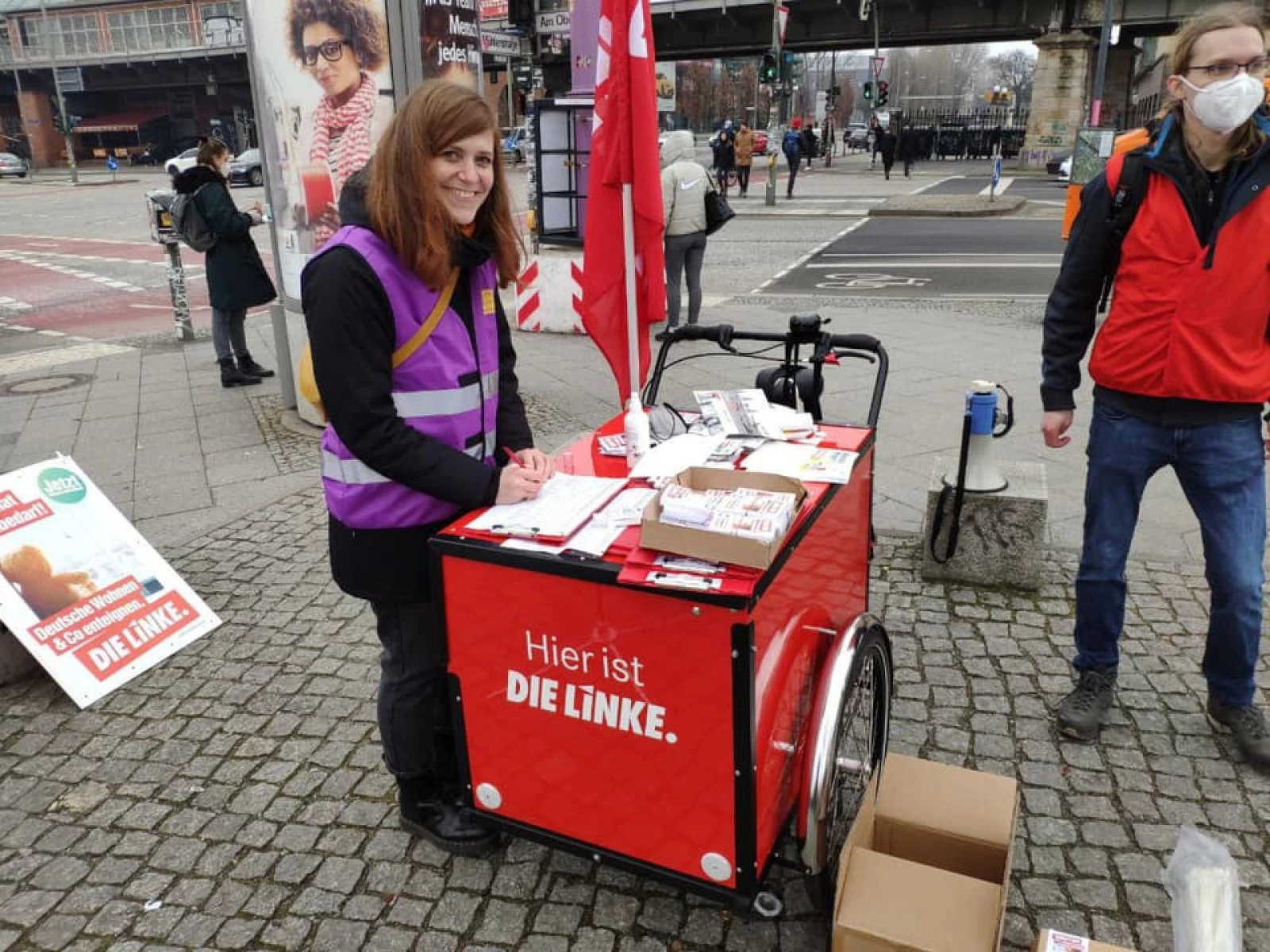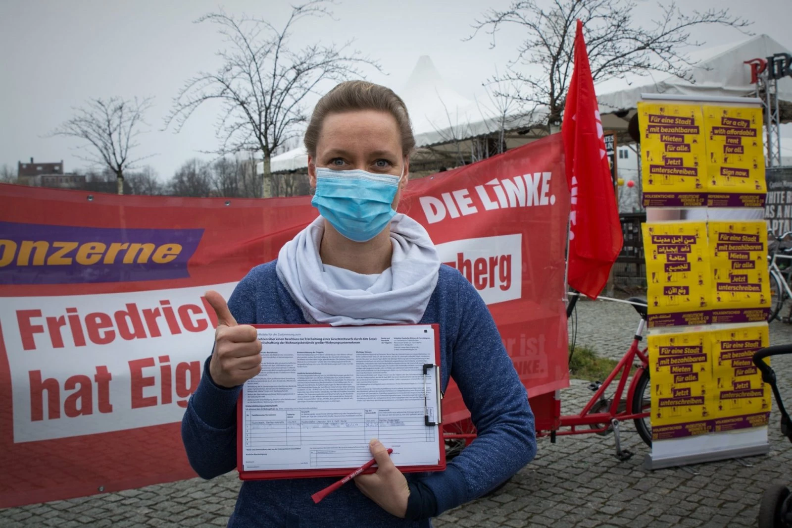 Das rote Lastenrad steht. Daneben ein Aufsteller mit Plakaten der Initiative „Deutsche Wohnen und Co enteignen“, auf denen in verschiedenen Sprachen zum Unterschreiben aufgefordert wird. Während wir weiter aufbauen und inmitten von Plakaten, Flyern, Beuteln und Stickern noch überlegen, wie alles so drapiert werden kann, dass es auch zur Geltung kommt, steht da auch schon die erste Passantin. Sie fragt, ob denn schon eine Unterschriftenliste da sei, sie würde gerne unterschreiben. Natürlich kann sie das!