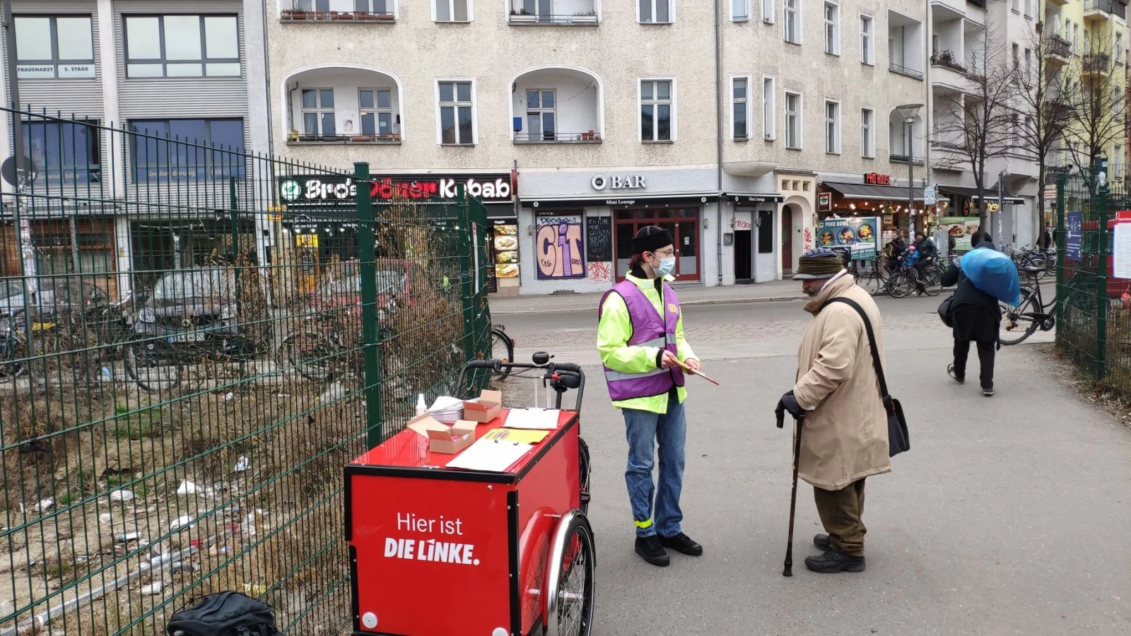 Zwischen dem Markttreiben und den schnellen Unterschriften gibt es auch immer wieder Passant:innen, die Zeit und Interesse an längeren Gesprächen haben. Da geht es dann häufig um Unklarheiten in Bezug auf die Umsetzung des Volksentscheids. Egal ob Fragen zur Entschädigungssumme, zur Anstalt öffentlichen Rechts, die die enteigneten Wohnungen verwalten soll, oder auch mal ein vermeintliches Gegenargument, irgendjemand der Genoss:innen hat immer die passende Antwort parat. Gut, dass es mit dem Lastenrad einen Ort gibt, zu dem alle immer wieder zurückkommen können, um sich auszutauschen, kurz durchzuschnaufen, die ausgefüllten Listen zu bunkern und die Klemmbretter neu zu bestücken.