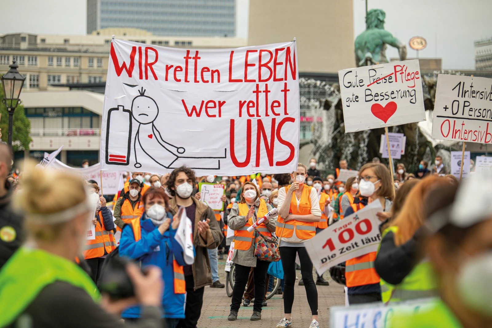 Pflegenotstand stoppen: Wir legen ein Sofortprogramm gegen den Personalmangel auf: Wir wollen Hilfsmittel des Bundes für Gehaltszulagen von 500 Euro im Monat für öffentliche und gemeinnützige Einrichtungen. Wir streiten für eine gesetzliche Personalbemessung in Krankenhäusern und Pflegeeinrichtungen, die den tatsächlichen Bedarf absichert. Wir wollen allgemeinverbindliche Tarifverträge mit guten Löhnen. Nur Pflegeeinrichtungen, die nach Tarif bezahlen, können Aufgaben der Pflegeversicherung übernehmen. Sorge ist keine Frage des Marktes, sondern der Menschlichkeit!