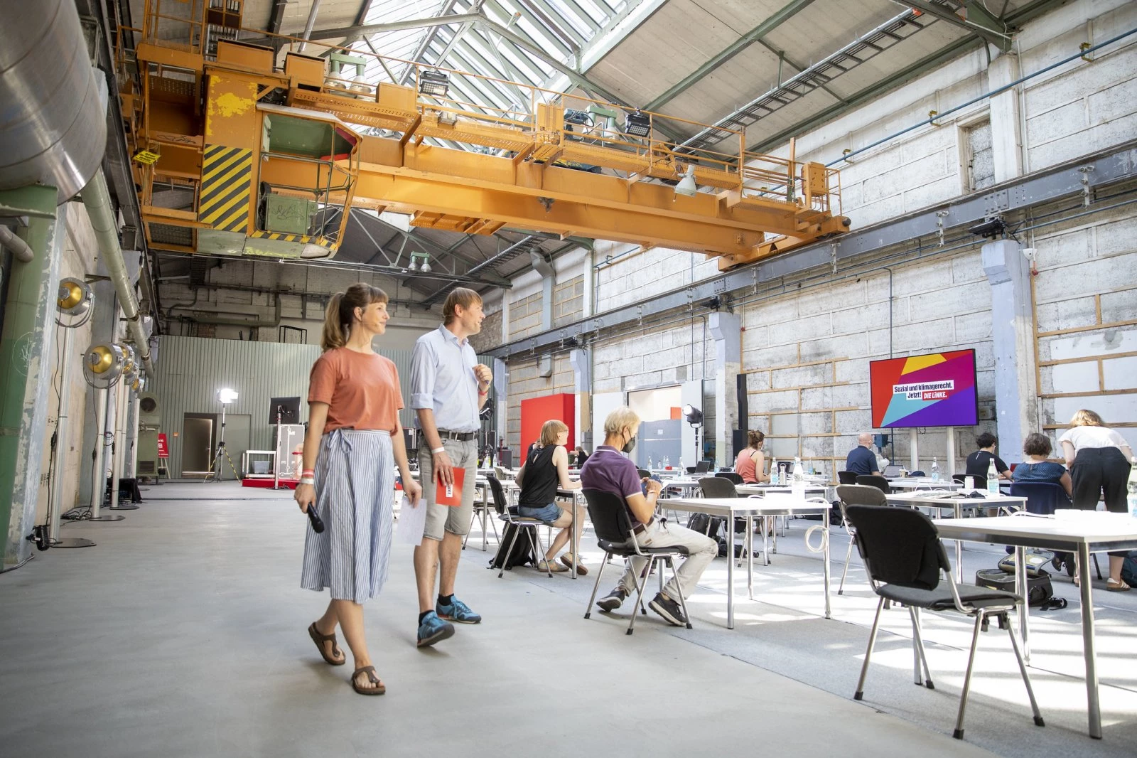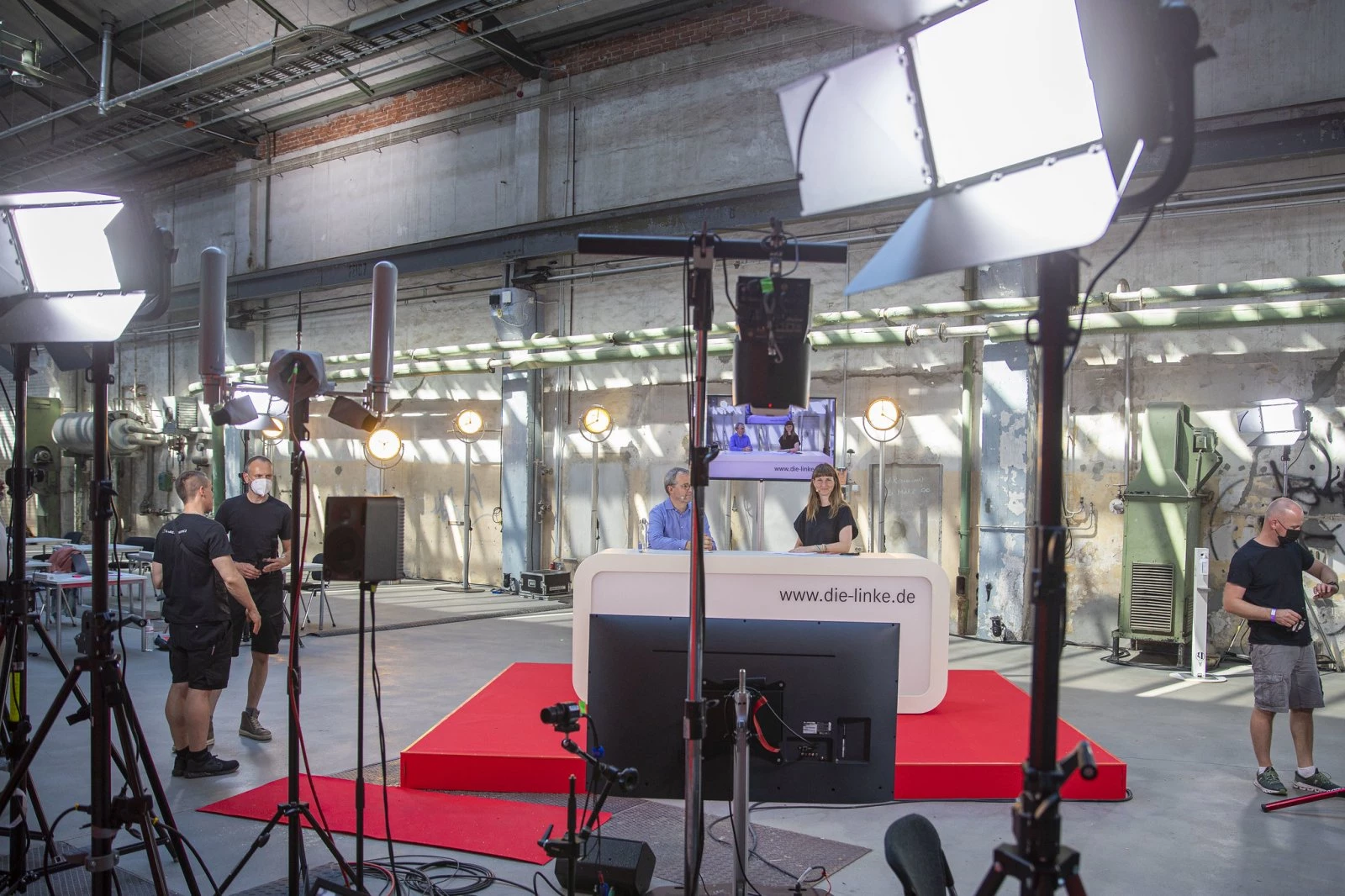 Auch der zweite Bundesparteitag der LINKEN muss in diesem Jahr digital stattfinden. Das bedeutet jedoch nicht, dass weniger Arbeit anfällt. Denn seit Wochen wird geplant, geprobt und vorbereitet. Trotz eines digitalen Parteitags kann auf ein gut strukturiertes Hygienekonzept nicht verzichtet werden. Noch bevor jemand in die Berliner Reinbeckhallen gelassen wird, muss ein Corona-Schnelltest durchgeführt werden. In einem weißen Zelt vor der Halle müssen sich alle testen lassen - egal ob Parteivorsitzende oder Reinigungskraft. Erst nach einem negativen Testergebnis dürfen die Räumlichkeiten betreten werden. Vorab erhielten alle, die heute in der Halle anwesend sind, einen personalisierten QR-Code, der beim Hineingehen und Verlassen des Gebäudes gescannt wird. Die hierfür Zuständigen erhielten ein Smartphone mit vorinstallierter App, um das zu kontrollieren. „Es dürfen maximal 320 Leute hereingelassen werden“, erzählt Juri am Einlass. „Danach stoppt das System automatisch und lässt keine weiteren Registrierungen zu“. Ausgenommen von dieser Regelung sind die Organisator:innen und Techniker:innen.
