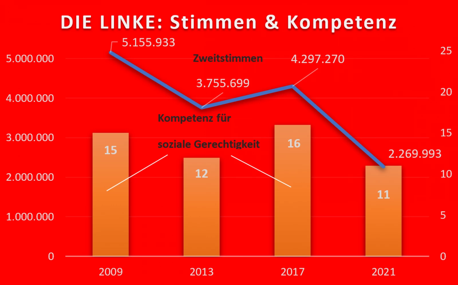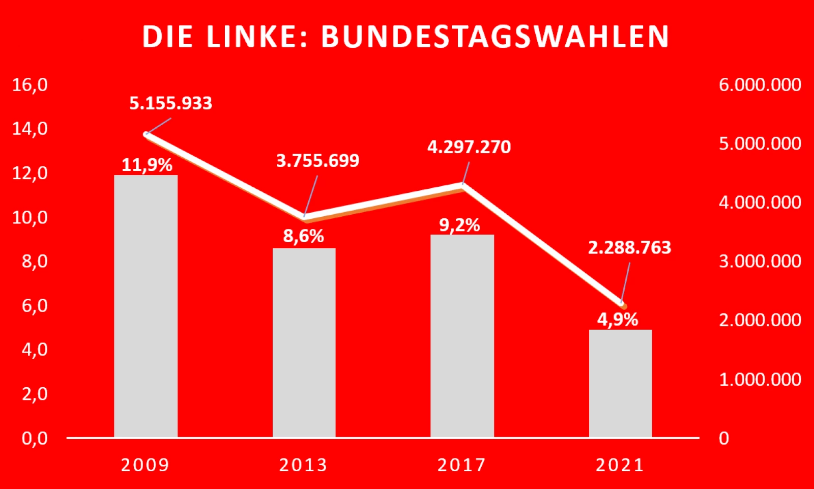 Das Ergebnis der Bundestagswahl 2021 ist für die Partei DIE LINKE katastrophal. Wir haben absolut rund 2 Millionen Wählerstimmen verloren und nur durch drei knapp errungene Direktmandate konnte ein Einzug in den Bundestag mit einer Fraktion erneut erreicht werden. DIE LINKE hat sich gegenüber 2017 flächendeckend in Ost wie West nahezu halbiert, gegenüber 2009 ist sie auf unter 40 Prozent ihrer damaligen Stimmen zurückgefallen. Dagegen konnte die SPD, die noch vor wenigen Monaten in Umfragen bei 15 bis 16 Prozent vor sich hindümpelte, sowohl die GRÜNEN als auch die Laschet-Union auf den letzten Metern abhängen und uns dabei noch über 600.000 Stimmen abnehmen