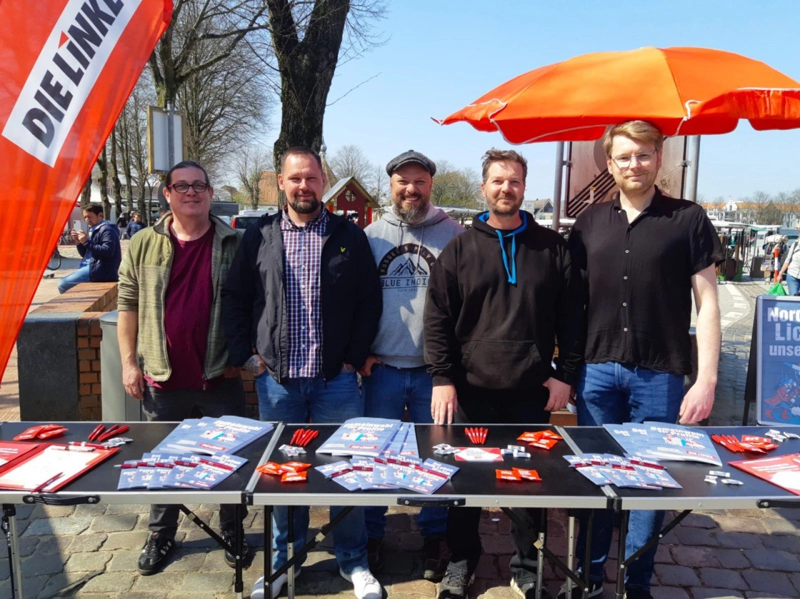 Es funktioniert nicht nur in Kiel, es klappt auch auf dem flachen Land, abseits der Städte. In Heide ist Thomas Palm gemeinsam mit Lars Thiele-Kensbock unterwegs. Beide sind hier Stadträte, beide klappern mit der Unterschriftensammlung die Gegenden ab, in denen Die Linke bisher auf größere Zustimmung stieß: Helgoländer Straße, Fehrsplatz, Föhrer Straße. Auf Deutschlands größtem umbauten Marktplatz - den hat nur Heide in Dithmarschen - stehen sie jeden Samstag mit einem Infostand. Sie sprechen die Leute an. Und als sich am 25.März mitten im Wahlkampf einige Menschen vor der St. Jürgens-Kirche am Südermarkt treffen und dort mit Transparenten und einem Rundgang um den Markt ihren Beitrag zum globalen Klimastreik leisten, ist Die Linke-Fahne auch dabei, getragen von Stadtrat Lars. Für Lars und Thomas ist es Klimastreik und zugleich ein kleiner Nachbarschaftstreff. Man kennt und vertraut sich, man sorgt sich gemeinsam um: Das gute Leben für Alle.