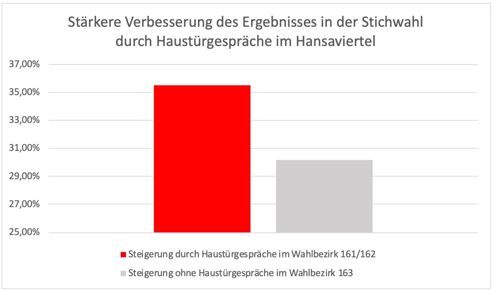In der Südstadt waren wir in den zehn Tagen vor der Stichwahl an 3800 Türen. In der Auswertung betrachten wir zwei Wahlbezirke, die direkt nebeneinander liegen. In dem Gebiet 262 waren wir an nahezu allen Haustüren, im Gebiet 263 haben wir keine Gespräche geführt. Die Ergebnisse in den beiden Gebieten zeigen einen klaren Unterschied, den wir auch in anderen Stadtteilen nachweisen können: In dem Gebiet 262, in dem wir an der Haustür waren, haben wir Evas Ergebnis stärker gesteigert als im nicht besuchten Gebiet 263. Der Unterschied beträgt 4%.