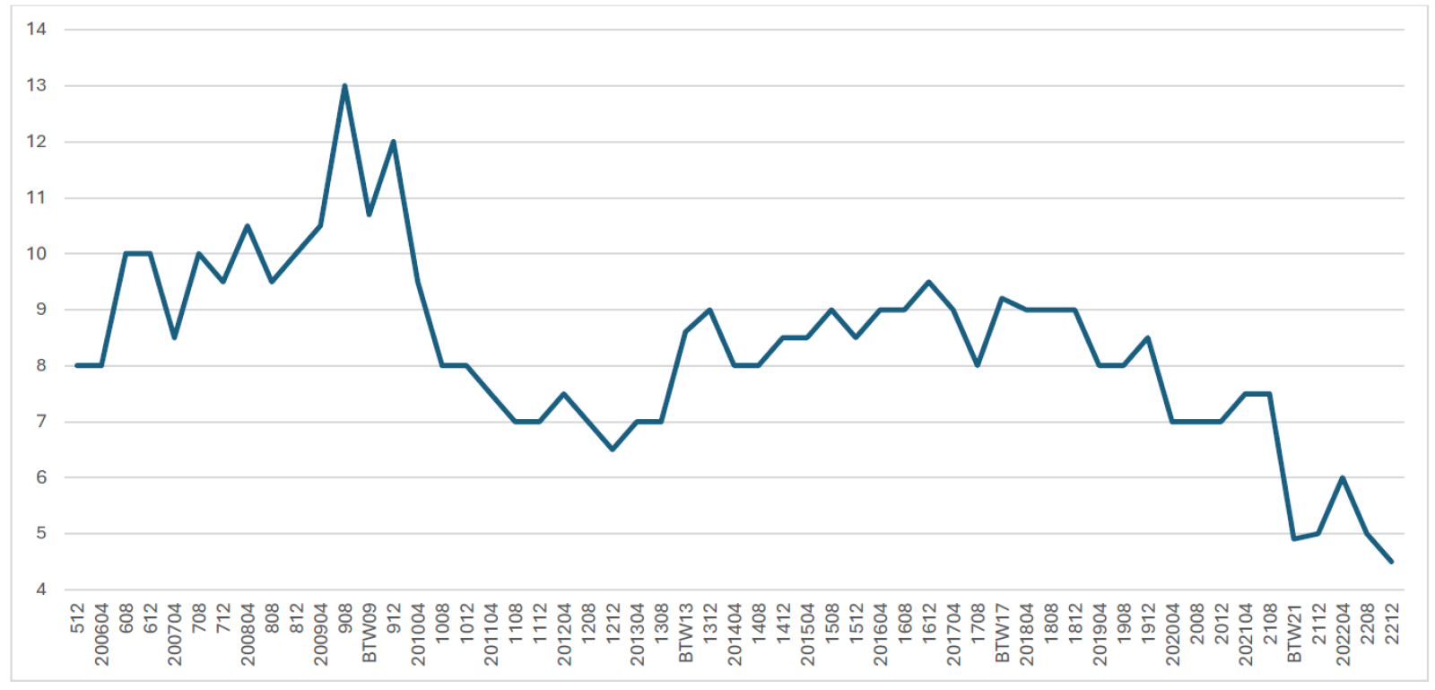 Die Wahlniederlage bei den Europawahlen ist schmerzlich, aber sie war erwartbar. Auch 2021 haben wir eine bittere Niederlage erlitten, unsere Wählerschaft hat sich beinahe halbiert. Es heißt, die Krise unserer Partei sei auf eine falsche Ausrichtung zurückzuführen, die seit 2012 erfolgte. Ein Blick auf die Bundestagswahlen widerlegt diese Deutung. Im Rückblick ergeben unsere Wahlergebnisse eine Welle. 2005 gewann die damalige Linke.PDS 4,12 Millionen Stimmen, 2009 waren es 5,16 Millionen, 2013 3,76 Millionen, 2017 rund 4,3 Millionen und 2021 2,25 Millionen Menschen, die für uns stimmten. Nach der tiefen parteiinternen Krise von 2011 bis 2012 haben wir uns erholt und gewonnen. Das zeigt sich auch, wenn man einen langen Blick zurück auf die Entwicklung von Wahlumfragen zur Bundestagswahl wirft (im Folgenden Allensbach im 4-Monate-Abstand seit Ende 2005 bis Ende 2022). Nach dem Fast-Spaltungs-Parteitag von 2012 wurden auch die Umfragen wieder besser.