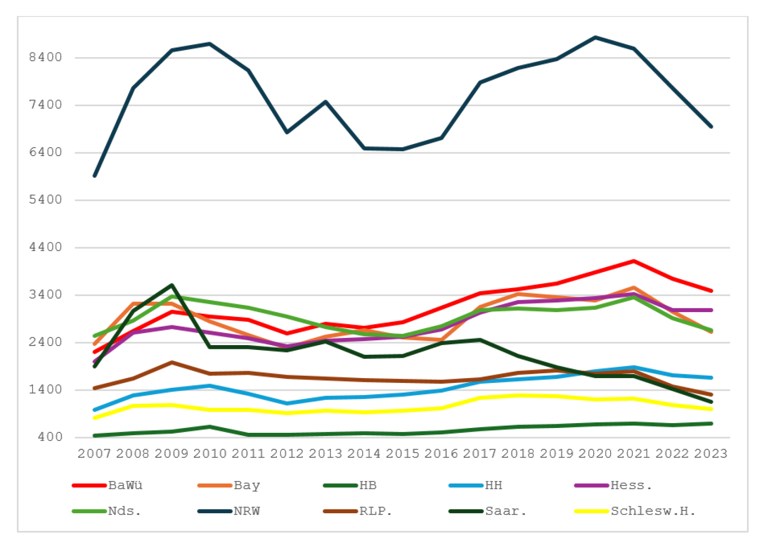 Eine ähnliche positive Entwicklung zeigt der Blick auf die Mitgliederzahlen. Nach einem Auf bis 2009/10 haben uns in den folgenden Jahren insbesondere bis 2012/13 etliche Menschen wieder verlassen – ab 2012/13 beginnt in den westlichen Landesverbänden eine zarte Trendwende (außer im Saarland, in dem ein tiefer Streit zwischen den Oskar Lafontaine und seinem früheren politischen Ziehsohn den Landesverband lähmte). Zwischen 2012 und 2021 steigt die Zahl der Mitglieder im Landesverband Niedersachsen um 14 Prozent, in NRW um 26, in Bayern um 56 und in Baden-Württemberg um 59 Prozent. Es liegt also nahe, den Grund für unsere Krise in dem zu suchen, was nach 2018/19 passierte.