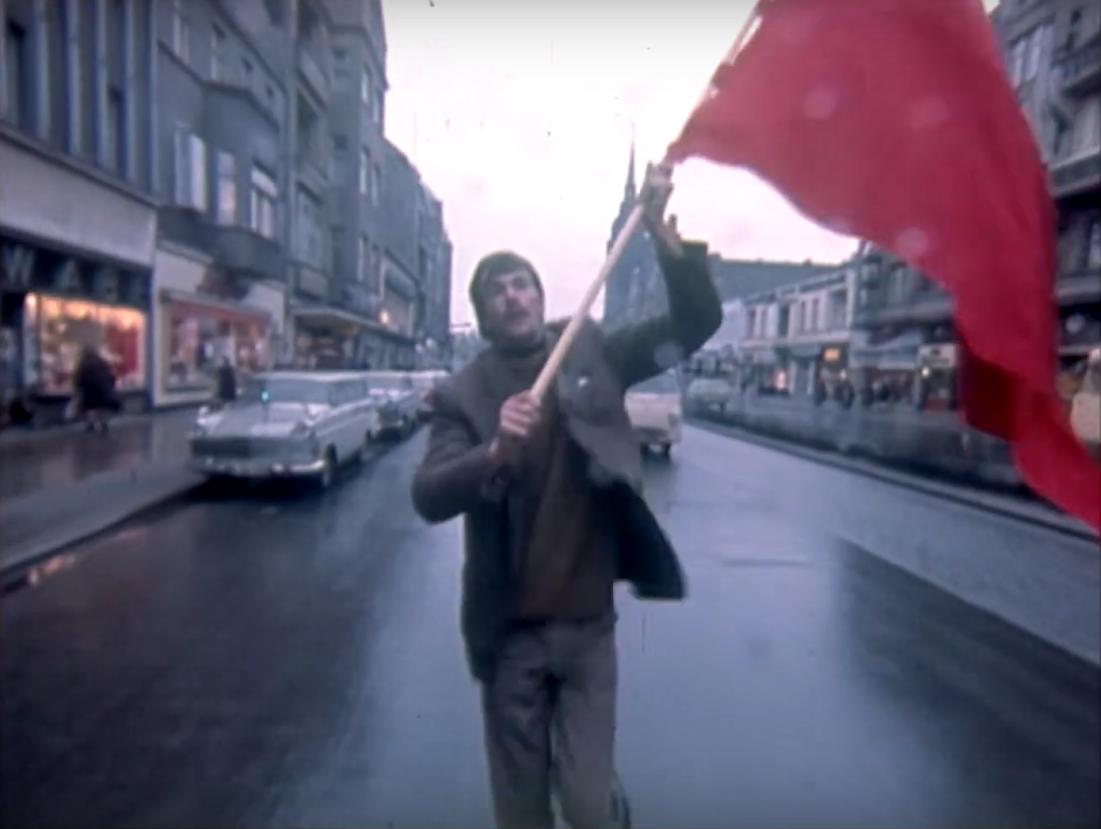 Endlich ein Film, der Denken ermöglicht und erfordert. Der weltläufig ist und doch nur um eines kreist: um eine Fahne, „ein Stück Stoff im Wind“, mit einem Titel, der noch nüchterner ist, „Farbtest 1968-2024[1]“, und sich herleitet aus dem Titel seiner Urfassung von 1968, „Farbtest Rote Fahne[2]“. Da beginnt schon das Nachschauen. Rote Fahne – was hebt sie heraus aus dem Wald von Fahnen? Und seit wann? Warum rot, und warum einfach nur rot? Vom Nachschauen zum Nachdenken: Wofür steht diese Farbe? Und wo in der Welt? In Berlin, in Deutschland, allüberall? Wie ist das zu erklären? Was hat es mit dem Jahr der Erstentstehung zu tun: 1968?